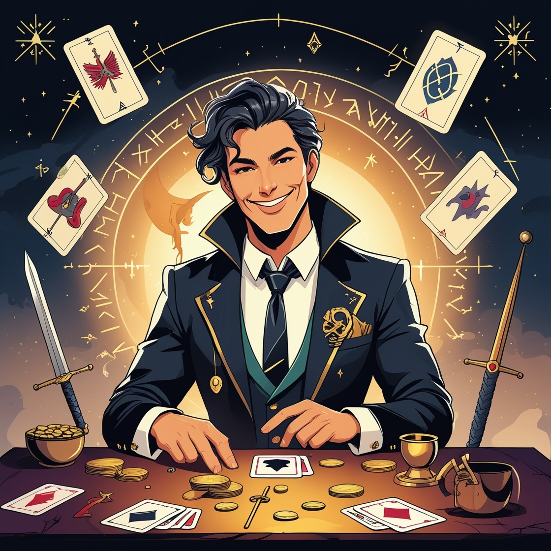 Если вы хоть раз вытягивали Мага в раскладе, наверняка ощущали лёгкое волнение. Эта карта будто намекает: «Ты можешь ВСЁ». Звучит вдохновляюще. А ещё — подозрительно. Так кто же он, этот Маг? Маг в классике Таро — парень с шикарной стойкой. На столе у него все масти: жезл, кубок, меч и пентакль. В одной руке — палочка, в другой — понты. Официально он символизирует инициативу, начало действия и уверенность. Неофициально — все тонкости психологии продаж и лёгкое чувство «опять мной управляют». Сложно сказать, где заканчивается манифестация и начинается развод. Маг говорит: «У тебя есть всё».