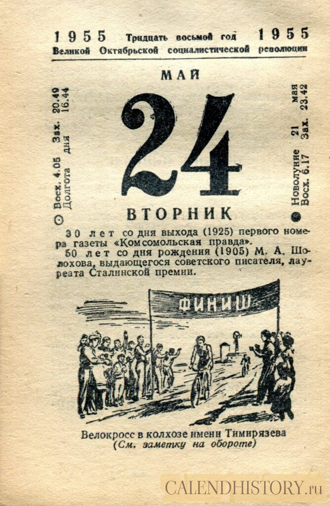 Итак, сегодня 24-го мая и у нас на календаре 1955-й год. Перед нами листок советского календаря Политиздата.