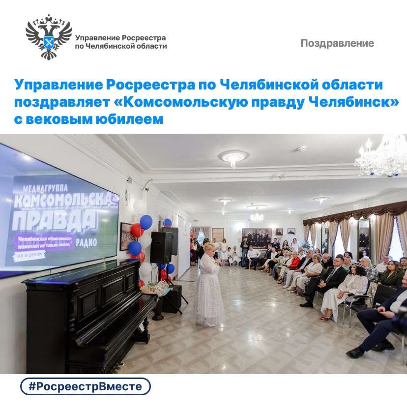 Управление Росреестра по Челябинской области поздравляет «Комсомольскую правду Челябинск» с вековым юбилеем. 24 мая 2025 года исполняется 100 лет со дня основания газеты «Комсомольская правда». В среду к юбилею «Комсомолки» в Доме общественного собрания прошло торжественное мероприятие – «Белый бал». В старинном особняке XIX века в центре Челябинска собрались друзья, партнеры и постоянные спикеры КП-Челябинск, в том числе представители регионального Росреестра. Мероприятие посетила и.о. руководителя Управления Росреестра Ольга Силаева и пресс-служба ведомства. В поздравительном адресе челябинский Росреестр поблагодарил редакцию газеты «Комсомольская правда» за тесное взаимодействие, благодаря которому удается повышать уровень правовой грамотности южноуральцев по вопросам оформления недвижимости и безопасности сделок с жильём. Публикации журналистов издания всегда выгодно отличаются понятным слогом, простым и доходчивым языком они излагают сложные юридические темы в сфере регистрации п