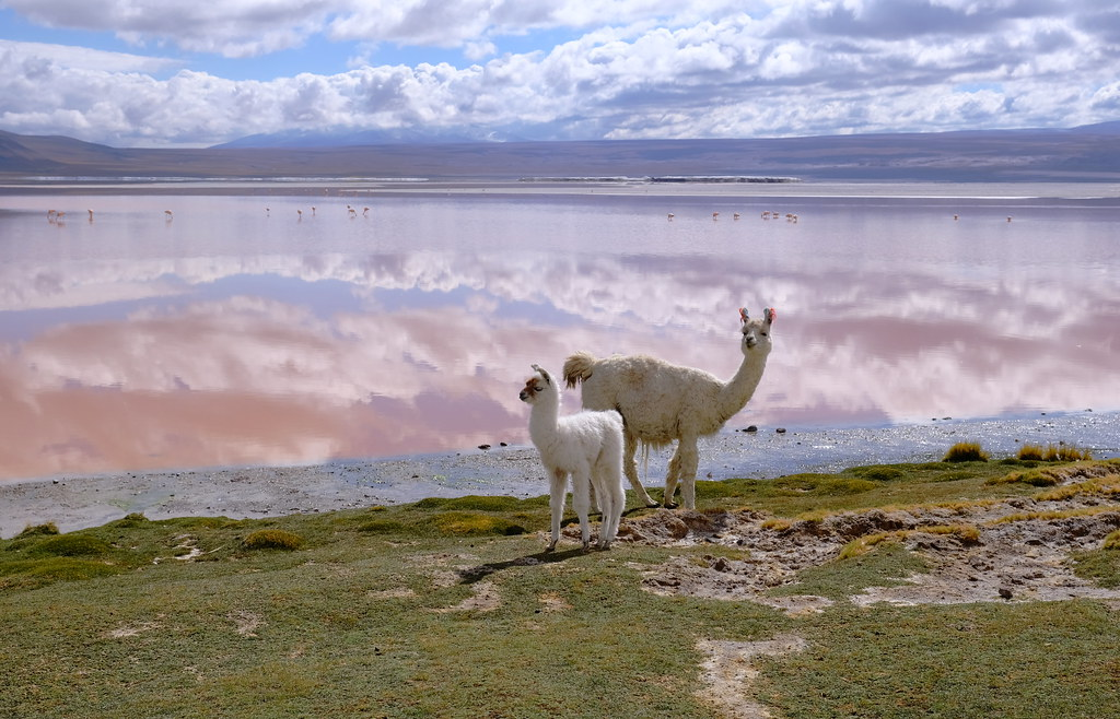 Сначала наше внимание привлекли живописно расставленные ламы по берегам водоёма.