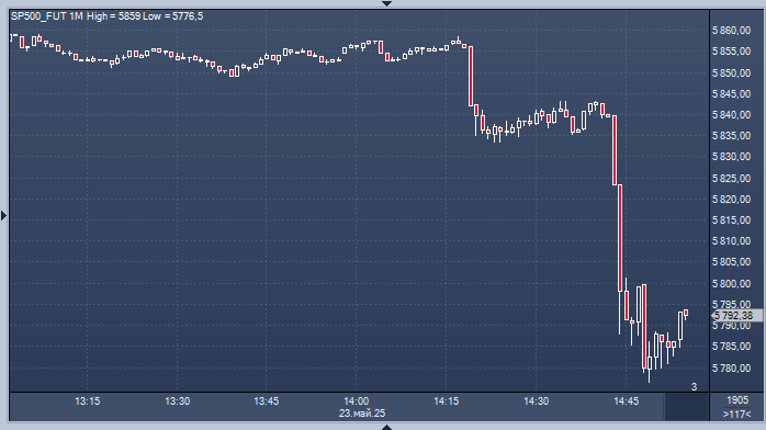 С Брюсселем сложно вести дела, переговоры по поводу торговли "ни к чему не ведут", подчеркнул он. График фьючсерса на индекс S&P 500 интервалами в 1 минуту Президент Дональд Трамп в пятницу заявил, что он «рекомендует ввести прямой 50-процентный тариф для Европейского союза» после жалобы на то, что торговые переговоры зашли в тупик. Новые высокие импортные пошлины вступят в силу с 1 июня, написал Трамп в Truth Social. Дональд Трамп в соцсети Truth Social:Европейский Союз, который был создан с основной целью извлечения выгоды из торговли с США, оказался очень сложным партнером. Их мощные торговые барьеры, налоги на добавленную стоимость, нелепые корпоративные штрафы, немонетарные торговые барьеры, манипуляции с валютой, несправедливые и необоснованные судебные иски против американских компаний и многое другое привели к торговому дефициту с США в размере более 250 000 000 долларов в год, что является совершенно неприемлемым. Наши переговоры с ними ни к чему не приводят! Поэтому я рекомен