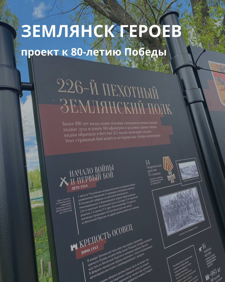 волонтёрский проект агентства «За_Природу» к 80-летию Победы. Землянск — это село в Воронежской области, жители которого внесли большой вклад в победу в Первой и Второй мировых войнах. Зимой 1915 года именно 226-й Землянский полк взял под охрану периметр крепости Осовец, а позже совершил подвиг, известный как «Атака мертвецов». В годы Великой Отечественной войны село попало под нацистскую оккупацию, здесь было организовано два концлагеря, но зверства врага не сломили дух жителей — они организовали партизанское подполье, а более двух тысяч землянцев ушли на фронт. Память об этих событиях в Землянске хранит площадь Алексея Леженина — героя Советского Союза. С первого дня войны он принимал участие в боевых действиях, совершил множество подвигов, в том числе в ходе освобождения Новороссийска. Но кроме названия площади никакой информации ни о самом Леженине, ни о подвигах землянцев в селе не было. Мы решили, что год 80-летия Победы — отличный повод, чтобы это исправить! По собственной иници