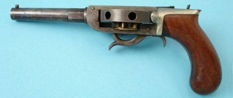 Казалось бы, очевидно, что у любого револьвера барабан вращается в вертикальной плоскости. Однако 150-200 лет назад это было ясно далеко не всем. Тогда наряду с револьверами классической схемы выпускались револьверы, у которых ось барабана и ствол были перпендикулярны, а заряды в барабане размещались «звездочкой», как патроны в пулеметах с дисковым питанием, вроде «Льюиса» или ДП. Горячим адептом таких систем был изобретатель из Нью-Йорка Джон Кохрэйн. Первый револьвер такого рода он запатентовал 22 октября 1834 года, за полтора года до того как Сэмюэл Кольт организовал производство своего «великого уравнителя». Семизарядный револьвер калибра 0,4 дюйма имел капсюльное воспламенение и стрелял круглыми свинцовыми пулями. Курок, расположенный снизу, перед спусковой скобой, взводился вручную, при этом синхронно проворачивался барабан. Для перезарядки и замены капсюлей барабан приходилось снимать. В сравнении с изделием Кольта револьвер Кохрэйна получился более тяжелым, громоздким и неудобн
