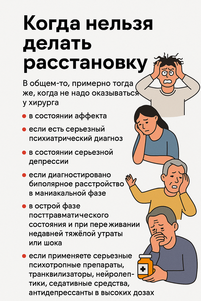 В общем-то, примерно тогда же, когда не надо оказываться у хирурга. Хеллингеровские расстановки — это метод глубокой психотерапевтической работы, способный вызывать интенсивные эмоциональные переживания. Существуют ситуации, при которых участие в расстановках может быть небезопасным или неэффективным.