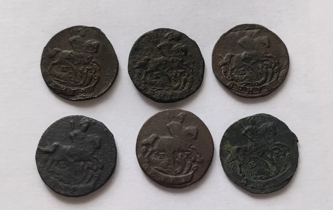 "Екатерининская деньга" - звучит красиво, а вот сама монета относится к таким, которые нельзя назвать распространенными, но в то же время и "невидалью" они не являются. Вот так выглядит екатерининская деньга (я выбрал самые красивые, которые у меня имеются): А красивыя - это, скорее всего, самые четкие. Еще у меня лежит примерно столько же, но не очень красивых. Чаще всего - они либо прилично затёрты (во время обращения), либо покрыты толстым слоем зелени. Оформление монеты - самое стандартное. На одной стороне изображен вензель и год чеканки, а на другой - всадник, поражающий змея и буквы монетного двора. Каталоги нам говорят, что по "стандарту" (по монетной стопе) вес монеты должен составлять 5,12 грамм. Но для этих монет подобная норма является лишь приблизительной, так как из-за технологии чеканки вес может сильно гулять. Вот, например, эти 6 монет на фото должны весить не менее 30 грамм. Но весят они вот столько: Есть очень легкие монеты: А есть монеты с "перевесом": Возможн