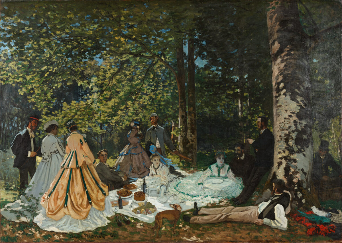 «Завтрак на траве» (1866) — это самая ранняя картина Клода Моне в московских собраниях, была куплена Сергеем Щукиным в 1904 году. Сюжет картины возник в 1865 году, когда Моне работал в Шайи-ан-Бьер, неподалеку от Парижа. Уже в этой работе заметен интерес мастера к пейзажу, который стал главной темой его творчества. До импрессионистов художники представляли природу либо обителью нимф, либо средой обитания поселян. У Клода Моне изображены горожане, собравшиеся на пикник в лесу. Картина принадлежит к числу редких для Клода Моне многофигурных произведений, однако позировало, вероятнее всего, только три человека. Принято считать, что Моне изобразил художников Фредерика Базиля и Альберта Ламброна, а также свою невесту Камиллу Донсье. Главное для мастера — не рассказ о тех, кого он пишет, а создание живописного единства между людьми и природным окружением. Истинным героем картины становится солнечный свет. Моне внимательно фиксирует, как просвечивает тонкая материя женских платьев, как ложатс