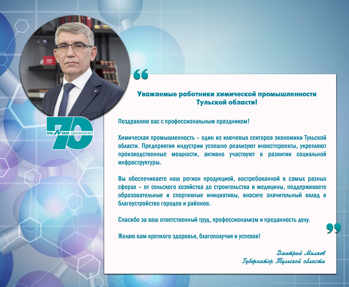 🤝 Поздравления щекинским химикам в связи юбилеем компании и профессиональным праздником шлют руководители федеральных органов власти и ведомств, Тульской области, Щекинского района, Первомайского поселка, многочисленные партнеры и друзья "Азота".