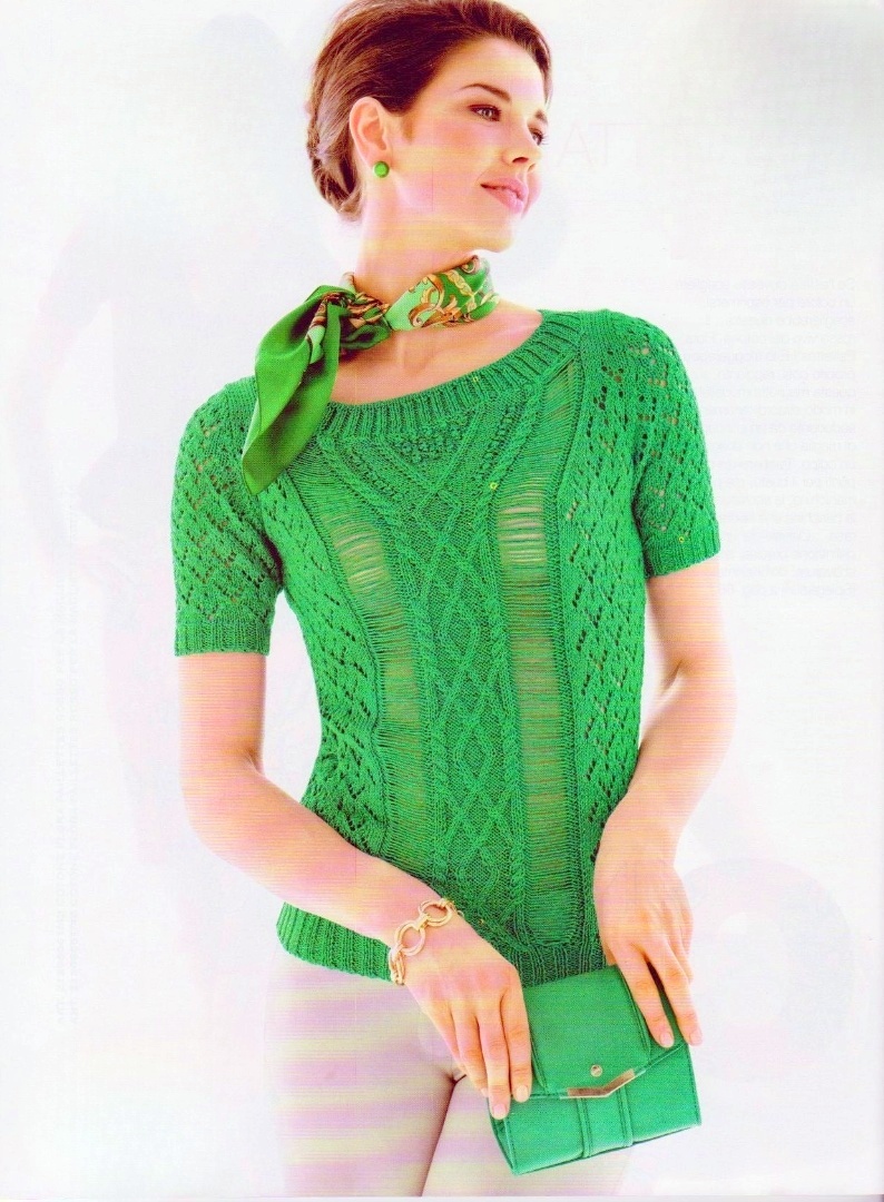 Изысканный изумрудный джемпер с разнообразием изумительных объёмных, рельефных и ажурных узоров. Тут и араны, и вертикальные вставки из спущенных петель, и красивый цветочный ажур! Прямой, слегка приталенный силуэт, короткий втачной рукав и круглый вырез горловины. Элегантная модель с несложным фасоном, но весьма замысловатыми узорами. Этот джемпер точно не для новичков, но он того стоит! Сочно-зелёный оттенок как нельзя лучше подойдёт для весны и будущего лета.