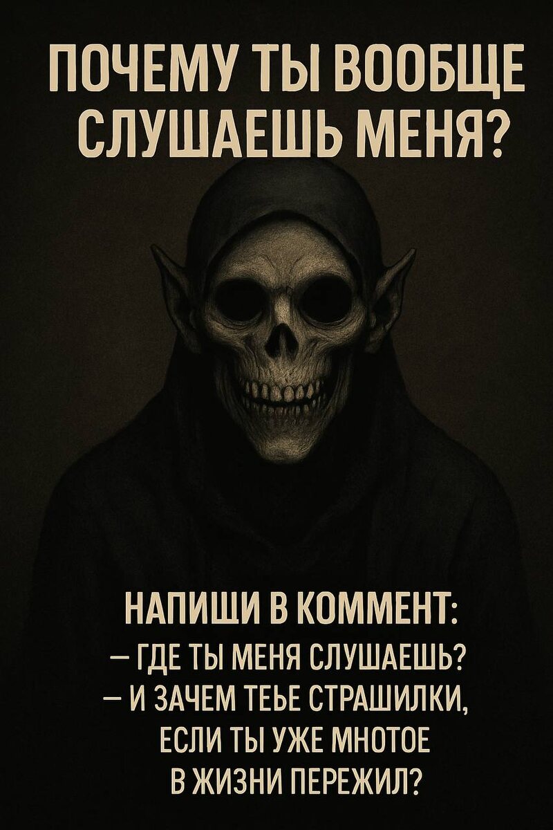 🧠 «Почему ты вообще слушаешь меня?» Ты взрослый. У тебя семья. Работа. Кредиты. Ты вроде не веришь в сказки. Но каждый вечер ты включаешь меня. Не потому что веришь в призраков. А потому что они — честнее, чем люди вокруг. 👁 Ты сидишь в темноте, в машине, на кухне, в ванной — И слушаешь. 🎧 Почему? 💬 Напиши в коммент: — Где ты меня слушаешь? — И зачем тебе страшилки — если ты уже многое в жизни пережил?