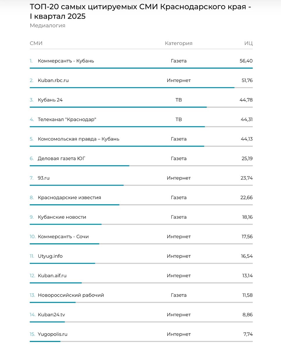 «Утренний Юг» занял четвёртое место среди самых цитируемых онлайн-изданий Краснодарского края по итогам первого квартала 2025 года. Об этом свидетельствуют данные портала «Медиалогия». В общем списке региональных СМИ «Утренний Юг» поднялся на шесть позиций — с 17-го на 11-е место. Напомним, что рейтинг «Медиалогии» формируется на основе индекса цитируемости (ИЦ). Этот показатель отражает качество распространения информации СМИ и учитывает количество ссылок на источник в медиа и социальных сетях. За период с января по апрель 2025 года ИЦ «Утреннего Юга» составил 16,54. Лидерами рейтинга стали газета «Коммерсантъ-Кубань», информационное агентство «РБК Краснодар» и телеканал «Кубань 24».