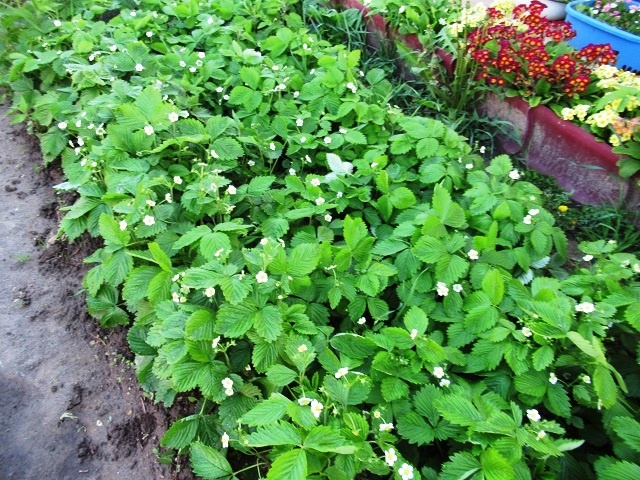 Вырастить землянику садовую из семян дело не сложное, семена хорошо всходят даже без стратификации, хотя стратификация желательна. Сеешь семена земляники в контейнер с землей, закрываешь крышкой и отправляешь неделеи на 2 - 3 на верхнюю полку холодильника. Всходят семена дружно, кустики после пикировки не перерастают, и если посеять пораньше, в конце января - начале феврале, то первый урожай ягод будет уже в первый год. Рассада земляники абсолютно неприхотлива, может даже расти в общей плошке до высадки в грунт без пикировки и будет к осени плодоносить. Так уменя получилость в прошлом году, всю осень были ягоды. Весной почистила грядку от старых листьев, подкормила аммиачной селитрой и земляника активно начала расти. На фото это земляника из семян прошлого года, выращенная без пикировки. Получилось так не специально, я и сама удивилась жизнестойкости земляники. Первая подкормка земляники из семян у меня была в апреле аммиачной селитрой для роста. В начале мая подкармливала ОМУ для яго