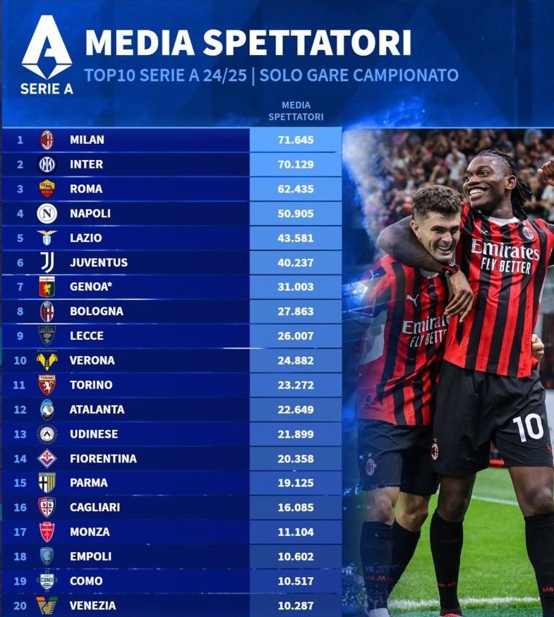 🇮🇹Милан лучший в Италии! Но только по количеству зрителей...С такими фанатами не страшны тяжелые времена. Напомним, в новом сезоне Милан не сыграет в еврокубках (сейчас они 9-е, но выше 7-го места точно не поднимутся). Больше, чем на Милан, в этом году ходят только на: 🇩🇪Боруссия Дортмунд - 81.365 🇩🇪Бавария - 75.000 🏴Манчестер Юнайтед - 73.814 🇪🇸Реал Мадрид - 72.664