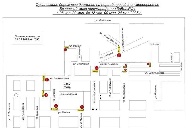 В центре Ставрополя 24 мая ограничат движение транспорта В Ставрополе 24 мая состоится всероссийский полумарафон «ЗаБег.РФ». В связи с этим с 8 до 15 часов ограничат движение транспорта: -по улице Дзержинского от Пушкина до проспекта Октябрьской Революции, -Булкина, -Советской, - проспекту Октябрьской Революции от дома № 1 до улицы Ленина, -переулку Интендантскому, -Суворова от Советской до Ставропольской, -проспекту К. Маркса от Голенева до проспекта Октябрьской Революции, -Маршала Жукова от Ленина до Дзержинского, - М. Морозова от Маршала Жукова до Пушкина, -Артема от Ленина до Дзержинского, - Кавалерийской от Дачной до Дзержинского. Объехать перекрытые участки автомобилисты смогут по улице Пушкина, Голенева, Ленина, Маяковского, Комсомольской, Дачной, Фрунзе, Ясеновской и Шаумяна. На время ограничения движения работа троллейбусных маршрутов №1, 2, 4, 9 будет приостановлена.