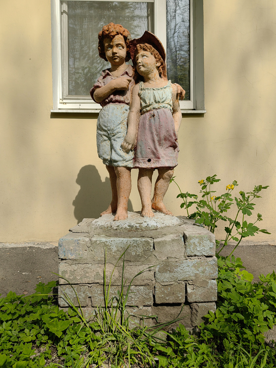 На прошлой недели мы выбрались в Пушкин, чтобы точечно посмотреть некоторые исторически значимые объекты или детали этих объектов. Об одном любопытном артефакте я написал ранее. Рядом с этим модерновым фонарным столбом (всего в 50 метрах) у одного из домов находится неизвестно откуда принесённая скульптура "Мальчик и девочка под зонтом" (иначе "Первая любовь"), производства завода "Санъ-Галли". Зонт утрачен. Такую же я вам показывал в одной из заметок, где упомянул про Самару. Там издалека клейма изготовителя увидеть не удалось, а на скульптуре в Пушкине получилось. По одной из версий скульптуру в канаве под Павловском на месте разрушенного особняка в деревне Глинки/Глинка (до революции её называли по разному) после войны нашёл мужчина (ныне уже покойный). Он привёз её к своему дому и поставил перед окнами квартиры. С тех пор она так и стоит здесь. В группе Вконтакте другой местный житель уточняет, что скульптура появилась у дома, примерно, в 1963 году. Но по его версии это случилось