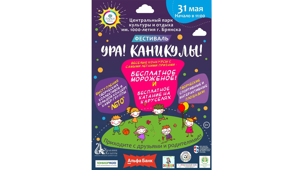 В субботу, 31 мая, в Брянске пройдет 4-й большой летний фестиваль «Ура! Каникулы!». Организаторы фестиваля – городское парковое объединение и управление культуры – обещают детям и родителям незабываемый праздник и море положительных эмоций.