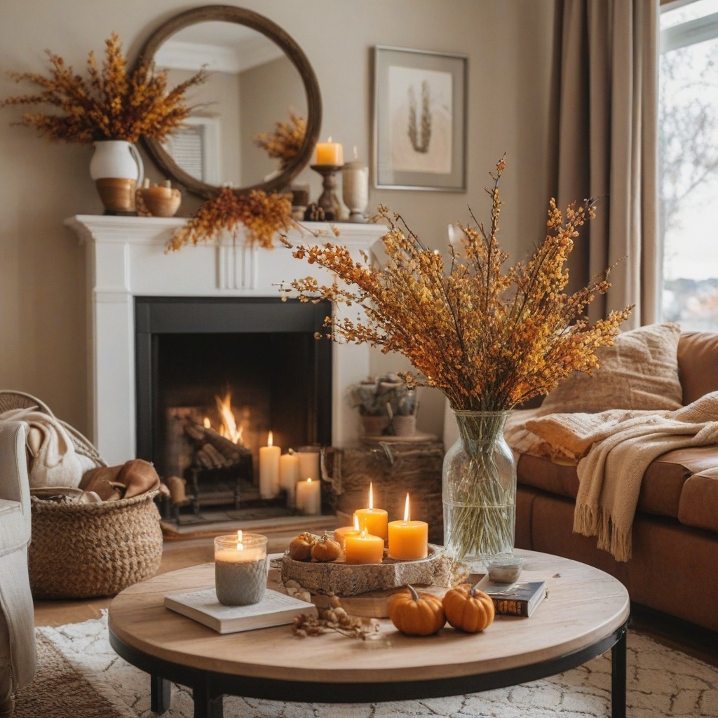 - Декор. Использование натуральных материалов, таких как дерево и камень, в сочетании с осенними элементами декора, такими как сухие цветы и ветки, помогает создать гармоничное пространство.