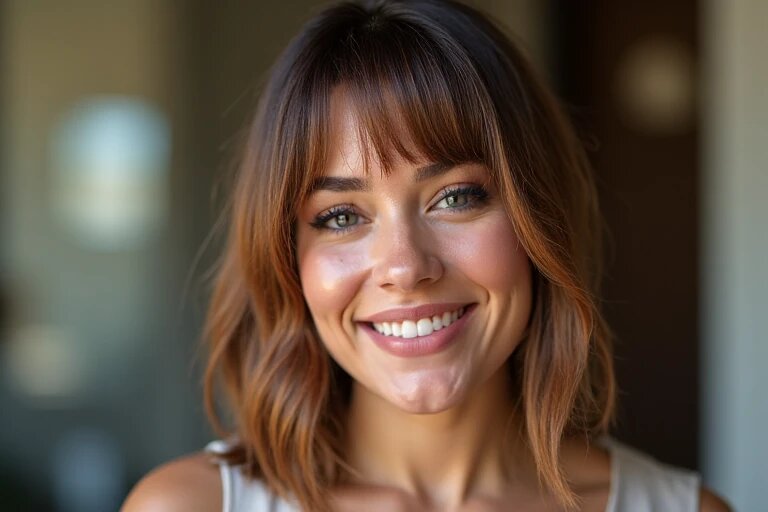 Почему работает: Прозрачная челка, как у Дженнифер Энистон, отвлекает на верхнюю треть лица.