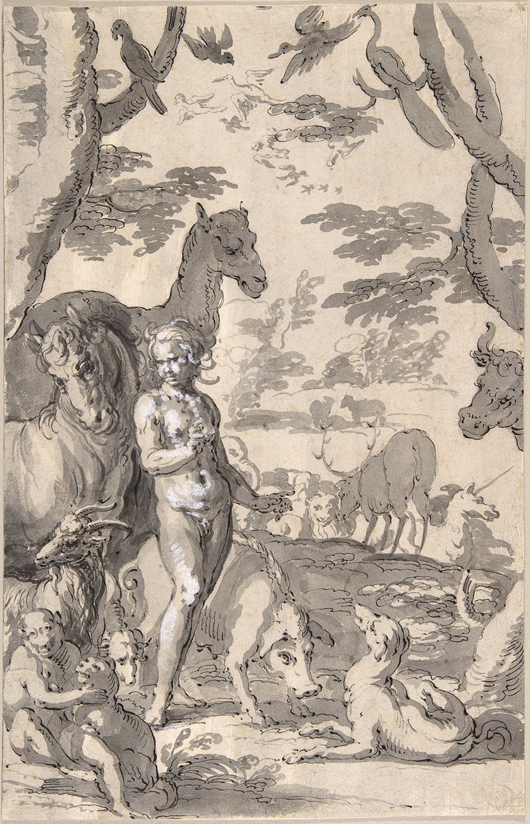 Этот сверкающий рисунок является характерным примером мастерства Иоахима Эйтевала (1566–1638). В редко изображаемой сцене из Книги Бытия Ветхого Завета Адам показан дающим имена животным в Эдемском саду. Среди всех живых существ, наполняющих землю и небо в этом библейском раю, Эйтевал включил также и мифического единорога (справа на заднем плане). Элементы стиля маньеризма, такие, например, как выразительная мускулатура Адама, на этом рисунке сочетаются с более натуралистичным подходом, включим тщательную проработку различных видов животных. Эйтевал, художник, живший в Утрехте на севере Нидерландов, завершил этот рисунок после своего возвращения из Франции и Италии (ок. 1588-92). Он, возможно, создал его примерно в то же время, что и связанную с ним картину «Адам и Ева», датированную 1614 годом и ныне находящуюся в Художественной галерее Шипли, Гейтсхед, Англия. Размер рисунка 32.5 x 21 см. Находится он в Метрополитен-музее.