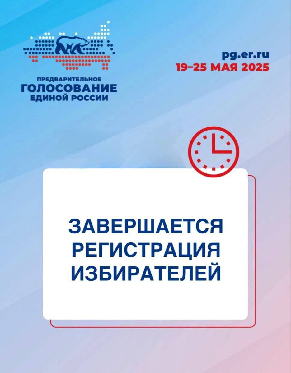 π₯Π£ΠΆΠ΅ ΡΠ΅Π³ΠΎΠ΄Π½Ρ Π·Π°Π²Π΅ΡΡΠΈΡΡΡ ΡΠ΅Π³ΠΈΡΡΡΠ°ΡΠΈΡ ΠΈΠ·Π±ΠΈΡΠ°ΡΠ΅Π»Π΅ΠΉ Π½Π° ΠΏΡΠ΅Π΄Π²Π°ΡΠΈΡΠ΅Π»ΡΠ½ΠΎΠΌ Π³ΠΎΠ»ΠΎΡΠΎΠ²Π°Π½ΠΈΠΈ ΠΠ΄ΠΈΠ½ΠΎΠΉ Π ΠΎΡΡΠΈΠΈ 23 ΠΌΠ°Ρ Π² 23:59 ΠΏΠΎ ΠΌΠΎΡΠΊΠΎΠ²ΡΠΊΠΎΠΌΡ Π²ΡΠ΅ΠΌΠ΅Π½ΠΈ Π·Π°ΠΊΡΠΎΠ΅ΡΡΡ ΡΠ΅Π³ΠΈΡΡΡΠ°ΡΠΈΡ ΠΈΠ·Π±ΠΈΡΠ°ΡΠ΅Π»Π΅ΠΉ Π½Π° ΡΠ°ΠΉΡΠ΅ pg.er.ru. β