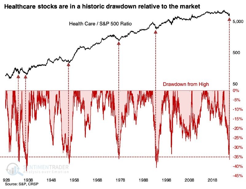 Для тех инвесторов, которые хотят попробовать получить результат лучше «среднего рынка», но при этом не уходить в сток-пикинг, е… Для тех инвесторов, которые хотят попробовать получить результат лучше «среднего рынка», но при этом не уходить в сток-пикинг, есть смысл время от времени производить ротацию между секторами. Вот, например, интересный и очень долгосрочный график от , на котором показана относительная динамика сектора здравоохранения США против широкого рынка за 100 лет. Просадка соотношения Сектор/Рынок приблизилась к исторически рекордным уровням. Это означает, что данный сектор «слишком сильно»- если ориентироваться на историю- отстал от рынка. И как наглядно видно из графика, вскоре после таких просадок сектор начинал сильно опережать широкий рынок. Тут нужно делать поправку на масштаб графика и его 100-летний период. Вовсе необязательно, что сектор здравоохранения начнет свою опережающую динамику прямо здесь и сейчас. Переход от отставания к лидерству может занять не