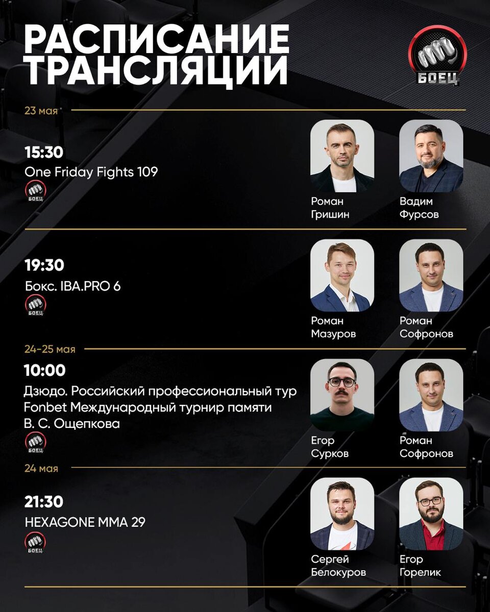 Что будем смотреть в эти выходные на Матч! Боец 📺 Комбо классной пятницы: традиционный ONE + бокс. Днем посмотрим ONE Friday Fights 109. В карде два наших бойца, поэтому будет интересно 😉 ССЫЛКА НА ТРАНСЛЯЦИЮ 👈 А вечер посвятим боксу. В Душанбе пройдет IBA.PRO 6. В главном бою Усмонов подерется с Пагарой, а еще по профи дебютирует Евгений Кооль 🥊 ССЫЛКА НА ТРАНСЛЯЦИЮ 👈
