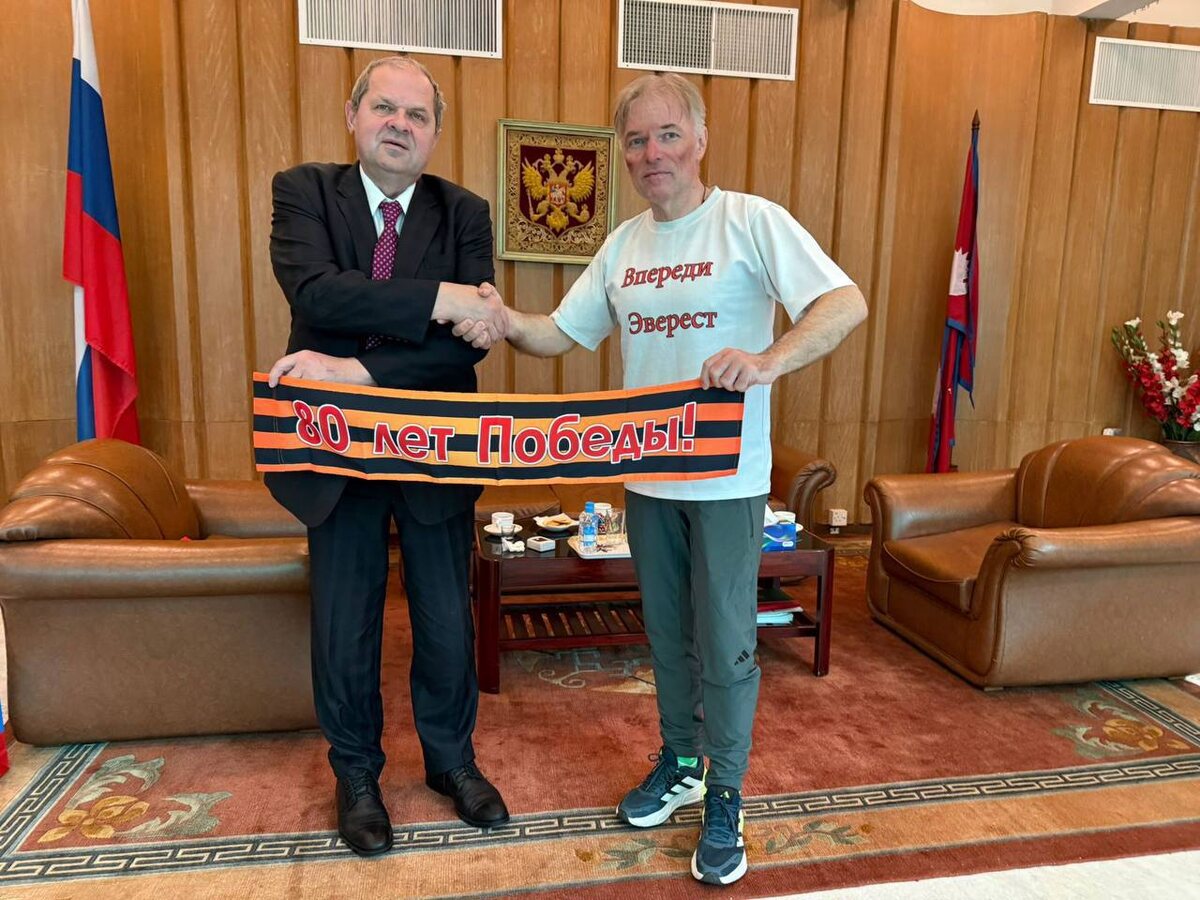 Передача Георгиевской ленты и Флага Победы с Эвереста 2025 послу РФ в Непале Алексею Новикову от Валерия Зайцева