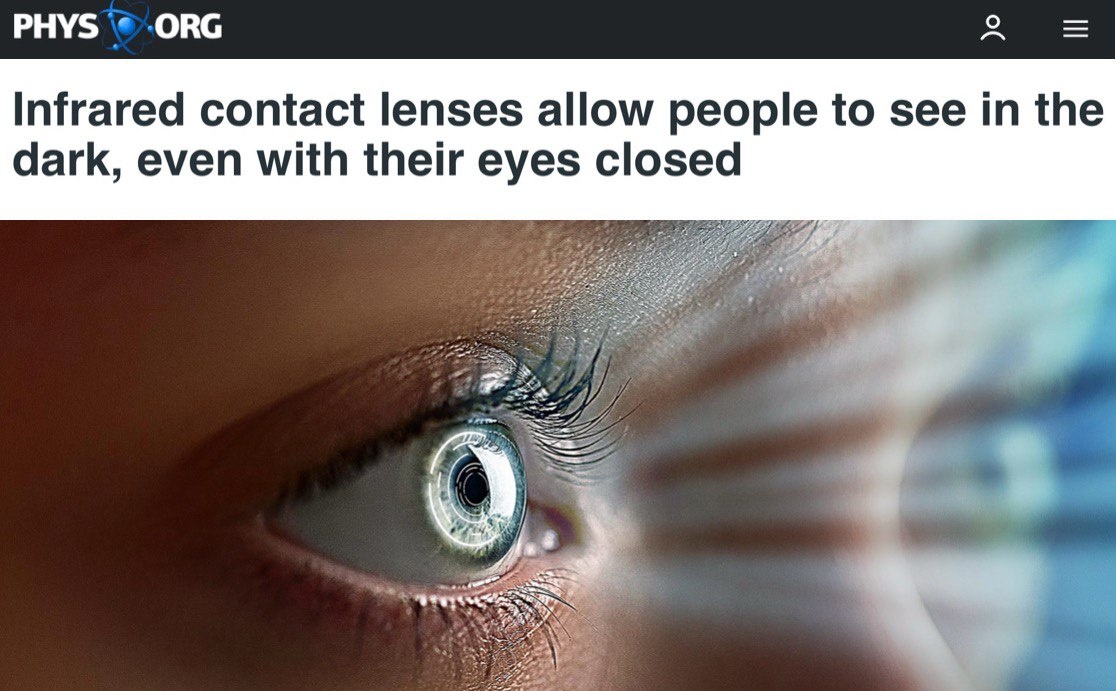 В Китае создали контактные линзы ночного видения — с ними человек видит в темноте и даже с закрытыми глазами. Наночастицы в линзах поглощают инфракрасный свет и преобразуют его в видимые волны. А через веко, т.е. с закрытыми глазами, инфракрасный свет проходит лучше — без помех.