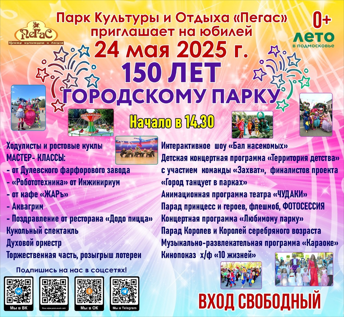 Парк культуры и отдыха «Пегас» приглашает на юбилей. Вас ждет насыщенная программа, полная развлечений для всей семьи: мастер-классы, развлекательные мероприятия, праздничный концерт, работа аттракционов, лотерея. Приходите, чтобы насладиться атмосферой праздника, пообщаться с друзьями и соседями, и просто хорошо провести время на свежем воздухе в прекрасном парке. Дата: 24 мая 2025 года Время: 14:30 Место: городской парк культуры и отдыха «Пегас», Советская, 36. #подмосковье #НашеПодмосковье #муниципальныйокругЕгорьевск #моЕгорьевск #егорьевскоетелевидение #егорьевскоетв #Егорьевск #администрацияегорьевск