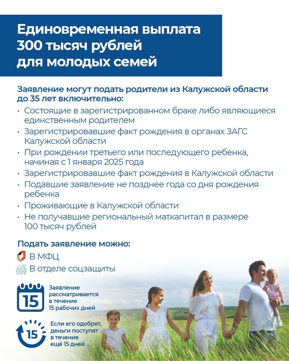 Как молодой семье получить 300 тысяч рублей? В Калужской области уделяется особое внимание поддержке молодых семей, особенно многодетных. На протяжении 5 лет регион лидирует в ЦФО по рождаемости третьих и последующих детей, что обусловлено, в частности, развитой системой социальной поддержки. С этого года введены новые меры, направленные на улучшение жизни молодых родителей. Теперь семьи, где обоим супругам - до 35 лет включительно, при рождении третьего и последующего ребенка могут рассчитывать на единовременную выплату в размере 300 тысяч рублей. При этом необходимо состоять в зарегистрированном браке или быть единственным родителем. По данным Министерства труда, уже 194 семьи подали заявки на получение этой поддержки. Об условиях получения выплаты читайте в карточке.