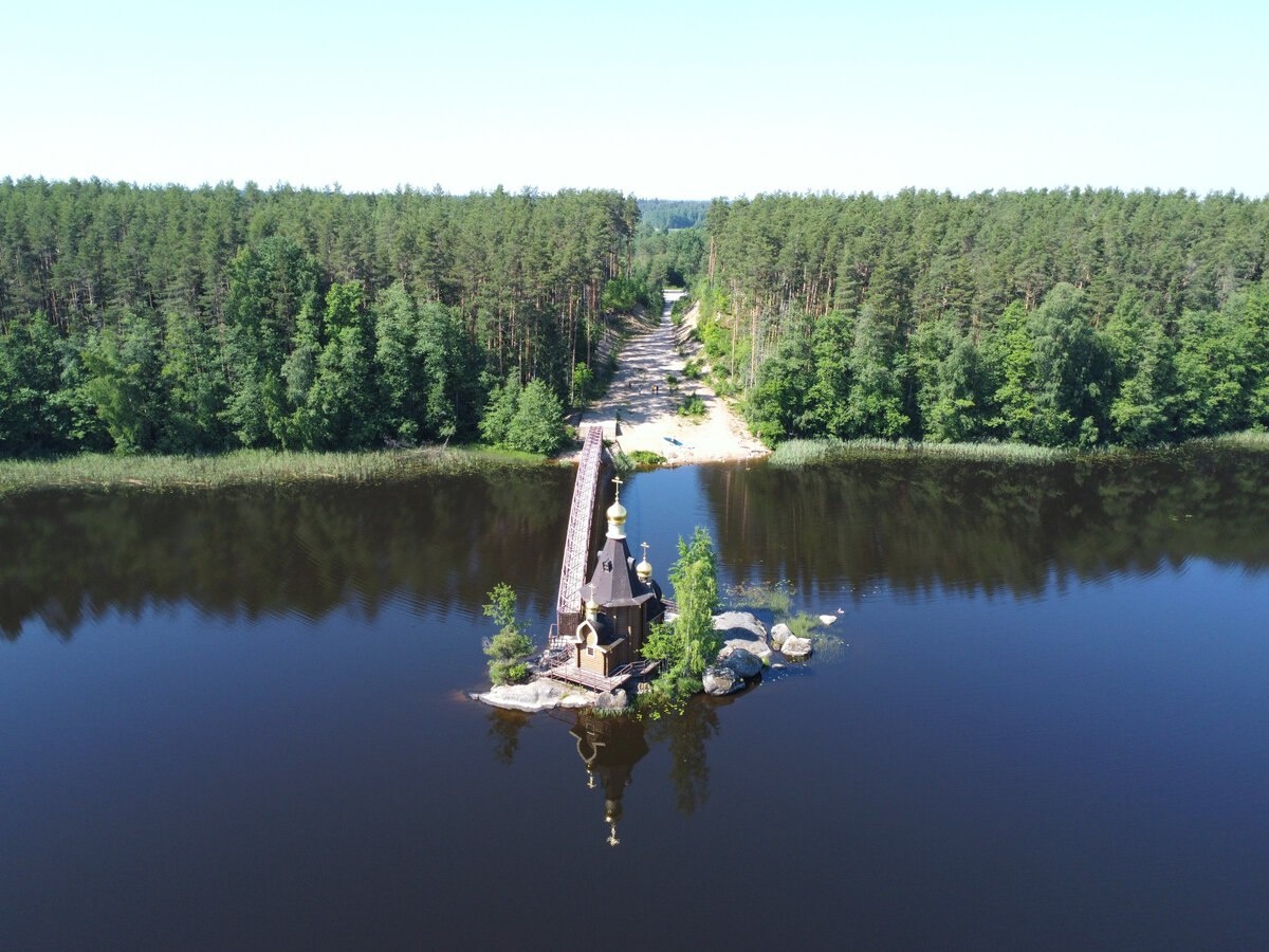Церковь Андрея Первозванного на Вуоксе, Ленинградская область. Эта живописнейшая церковь, расположенная в Приозерском районе на маленьком каменистом островке на реке Вуокса, и в отличие от ранее упомянутых, была построена совсем недавно: строительство закончилось и церковь была освящена в 2000-м году. Идея основать храм на огромном камне посредине реки пришла в голову профессору университета имени Герцена: по его задумке, храм предназначался для лодочников, сплавлявшихся по Вуоксе. Его начинания поддержал дачник из располагавшегося неподалёку крохотного села Васильево. В 1994 году началось строительство храма. Автором проекта стал архитектор Андрей Ротинов. Строительство продолжалось несколько лет, и лишь в 2000 году храм открыл свои двери для прихожан. Говорят, церковь даже попала в Книгу Рекордов Гиннеса, как единственная в мире церковь, построенная на крошечном острове, фундаментом для которой служит монолитная скала, выступающая из воды. Однако как таковых прихожан у церкви Анд