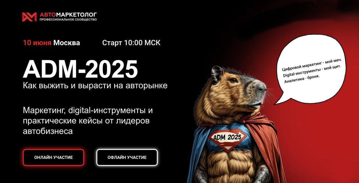 🔥Все нужное для роста в 2025 году, — вам остается только подключиться! Команда «Автомаркетолога» рада пригласить всех желающих на конференцию ADM-2025. Это конференция про автомобильный маркетинг в эпоху трансформации, где вы получите только проверенные решения для роста в кризис. Отмечайте в своих календарях: 📆 Дата: 10 июня, старт в 10 часов Мск 📍 Формат: онлайн и офлайн (Москва) 💻 Онлайн-участие — бесплатно, после регистрации В программе ADM-2025 только практика и реальные кейсы, готовые решения, применимые в digital, продажах и клиентском сервисе. К участию пригласили практиков и экспертов из автобизнеса, IT и маркетинга, с ними можно будет взаимодействовать, задавать вопросы и получать ценные рекомендации в прямом эфире. Для участия в офлайне или для предварительной регистрации на бесплатную онлайн-трансляцию переходите на сайт ADM-2025 и оставляйте свою заявку. ❗️Зарегистрироваться можно уже сейчас!