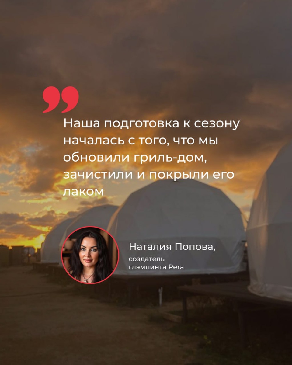 ✨ Нам всегда приятно делиться новостями, когда наши знания и опыт находят отклик в профессиональном сообществе. Создательница глэмпинга Pera Наталия Попова выступила в роли эксперта в свежем материале от "Hospitality Guide" — издании о трендах индустрии гостеприимства. ⠀ 🎓 Например, на вопрос о подготовке к сезону Наталия ответила следующее: — "Наша подготовка к сезону началась с того, что мы обновили гриль-дом, зачистили и покрыли его лаком, — рассказывает Наталия Попова. — Засыпали территорию тырсой. Все деревянные поверхности также были пропитаны морилкой, она придала насыщенный цвет. Это касается подиумов, лестниц, уличного туалета, летнего душа. На территории появилась новая баня, которая сейчас обустраивается, и в скором времени будет запущена. Провели техническое обслуживание велосипедов 🚴♂️, которые сдаются в аренду, в планах сделать для них крытую парковку. Плюс мы установили новый баннер, сделали новую фотозону с диванчиком ✨. В планах создать еще одну — на обрыве с зер