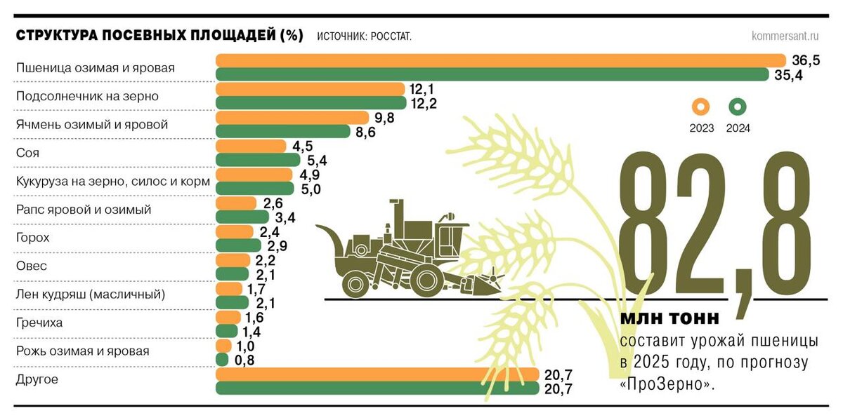 🔥 Российские поля меняют облик! Фермеры массово отказываются от пшеницы и ржи в пользу масличных культур. Разбираем, почему это происходит и что нас ждет в 2025 году. 📉 Зерновые: почему их "списывают со счетов"? • По данным журнала Коммерсант пшеница больше не приносит доход! * В 2024 году площади под пшеницей сократились на 4,2%. В 2025 году тренд продолжается: ожидается сокращение еще на 1-4%. * Рентабельность на грани: на Юге она еле держится (5-10% — про инвестиции можно забыть), а в Поволжье и вовсе ушла в минус. * Причины известны: экспортные пошлины и квоты, рост себестоимости, низкие мировые цены и крепкий рубль. • Рожь — еще хуже! * Площади рухнули на 21,5% за год! * Рентабельность падает, спрос ограничен внутренним рынком, где и так снижается потребление. * Если пшеницу еще можно спасти (например, отменив пошлины), то с рожью все сложнее: ее посевы сокращаются уже 15 лет подряд. 🚨 📈 Масличные: новый золотой стандарт? • Тут всё наоборот! Их площади в
