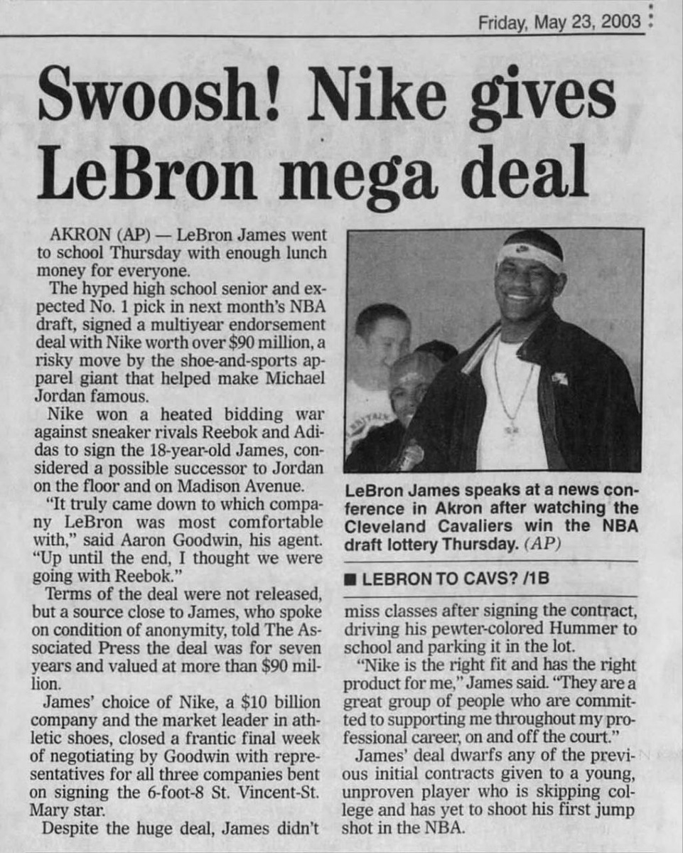 🏀 Nike × LeBron 22 года назад Найки подписали ЛеБрона Джеймса (который на тот момент не отыграл ни единой игры в NBA) за рекордные тогда 87 миллионов хрустящих. В 2015 году Король подпишет пожизненный контракт на 1 миллиард, а в 2021 году парни из Свуша откроют Центр Инноваций ЛеБрона Джеймса со штаб-квартирой в Орегоне. @prokickstination