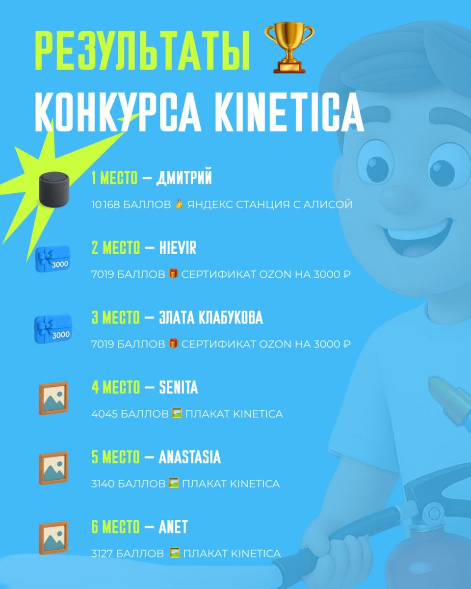 Пожар потушен. Итоги спецпроекта KINETICA 🔥 В честь нашего 18-летия мы запустили спецпроект — игру про антикризисное управление в digital, в которой каждый мог почувствовать себя настоящим пожарным маркетинга. Вы тушили дедлайны, вытаскивали проекты из огня и спасали коллег из горящих чатов. Все как в жизни — только с баллами, наградами и азартом. И вот — герои, которые справились лучше всех: 🥇 Дмитрий — 10 168 баллов, он получает Яндекс Станцию с Алисой 🥈 Hievir — 7019 баллов, дарим сертификат на Озон на 3000 ₽ 🥉 Злата Клабукова — 5044 балла, еще один сертификат на Озон на 3000 ₽ 🔥 4 место — Senita (4045 баллов) 🔥 5 место — Anastasia (3140 баллов) 🔥 6 место — Anet (3127 баллов) Они получают фирменный плакат KINETICA. Повесьте рядом с монитором — пусть напоминает, что вы умеете вытаскивать проекты из самого ада. Мы свяжемся с победителями в ближайшее время. Если вы тоже хотите себе такой спецпроект — чтобы привлекать новых лидов, поднимать охваты и узнаваемость бренда,