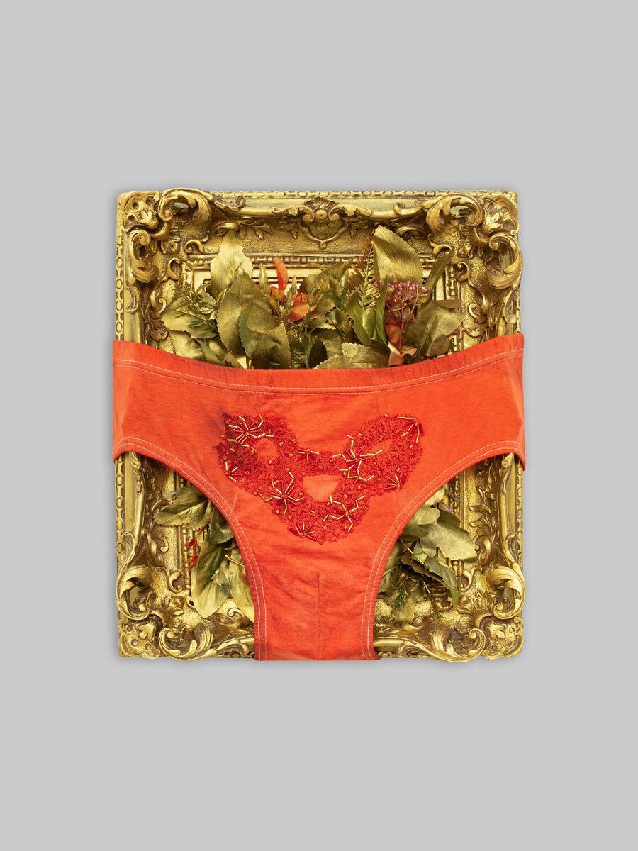 Объект RomaUvarovDesign x ODOR создан по подобию своеобразного киота с золотыми окрашенными вручную лепестками, дополненного трусами с винтажным кружевом, окрашенными ручным методом египетскими красителями и отваром из цветков африканского гибискуса с кутюрной вышивкой бисером и стеклярусом. Размер объекта: 38см х 33см Цена: 25.000₽ Для уточнения деталей и покупки- напишите нам!
