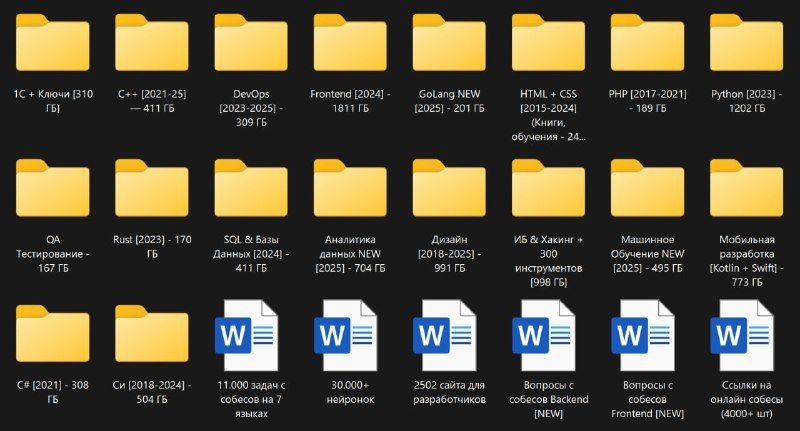😎 ГИГАБАЙТЫ ЗНАНИЙ ОТ IT-ШКОЛ В ОДНОМ МЕСТЕ Смотрите, что сделал айтишник из «VISION»! Он собрал огромное количество материалов от различных IT-школ и выложил их в открытый доступ. Теперь каждый может найти что-то полезное для себя, независимо от уровня подготовки. 📚 Что внутри? - Python — 1202 ГБ - Frontend — 1811 ГБ - C / C++ / C# — 1100 ГБ - Java — 804 ГБ - SQL & Базы данных — 411 ГБ - DevOps — 309 ГБ - ИБ & Хакинг — 998 ГБ - Kotlin / Swift — 773 ГБ - PHP — 189 ГБ - GoLang — 201 ГБ - Rust — 170 ГБ - QA / Тестирование — 167 ГБ - 1C + Лицензии — 310 ГБ - Машинное обучение — 495 ГБ - Аналитика данных — 704 ГБ - Дизайн — 991 ГБ 📂 Материалы постоянно обновляются и пополняются. Не упустите шанс получить доступ к огромной базе знаний, которая поможет вам прокачать свои навыки или начать карьеру в IT. Что думаешь по этому поводу? Пиши в комменты! Обязательно сохрани, чтобы не потерять! #IT | ВСЁ ПРО AI | AI NEWS | Дзен | ОК