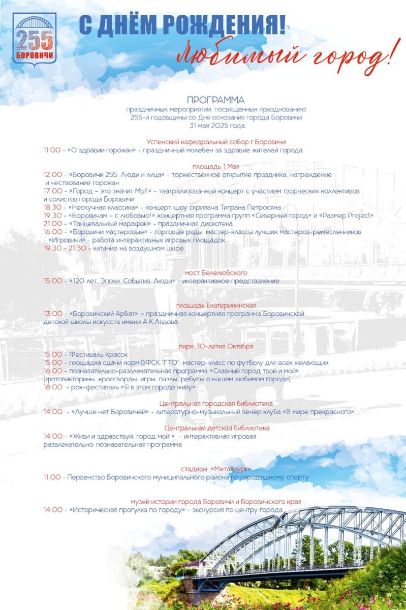 ✨Боровичи готовятся к большому празднику – 255 лет со дня присвоения статуса «город» — и для всех жителей и гостей нашего города мы создали яркую, насыщенную программу! Концерты, мастер-классы, уличные гуляния и многое другое ждут вас в разных уголках Боровичей. 💥 31 мая приходите всей семьёй, зовите друзей — давайте вместе сделаем этот день по-настоящему тёплым, шумным и незабываемым! #ЕР53 #ЕР53Боровичскийрайон #Боровичи255