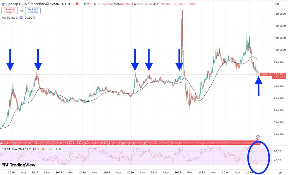 Рубль пришёл на сильный горизонтальный уровень, который виден ещё с 2014 года. При этом по RSI на неделях и на месяцах он на минимумах 🤔