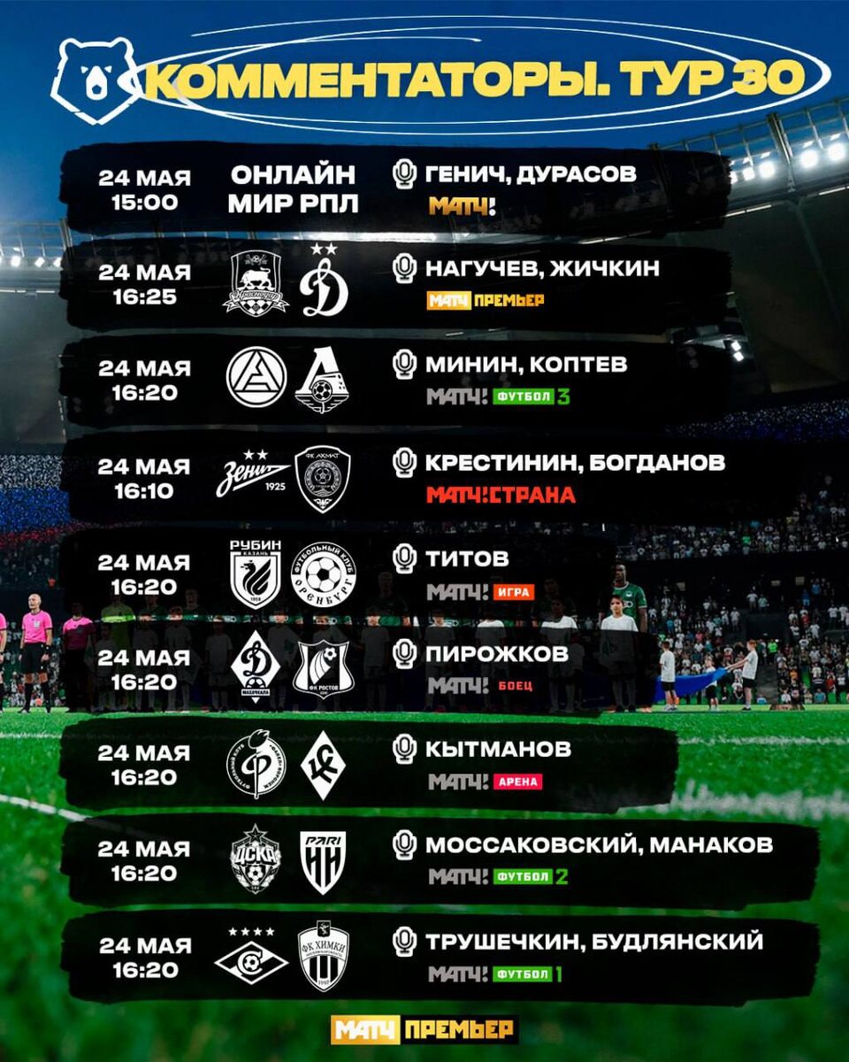 Расписание 📅 Каналы 📺 И комментаторы 🎤 30-го тура: