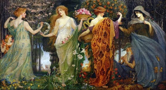 Слово Весна – сокращение слова Весимна, а слово Осень есть небольшое сокращение от слова Осимень. То есть, Весной листья пошли В смену, а Осенью они Осменились, осыпались. От слова СтоумпЕния происходит слово Степень. В зависимости от времени дерево покрыто листьями в разной Степени. Весной, листья вначале малы, и только потом дерево оденется полностью, в полную Степень. Оно одевается Постепенно. А Осенью дерево сбрасывает листву тоже Постепенно. Не разом. С каждым днём Степень его одетости падает и падает… И так, пока оно не разденется до гола. На фото: “Маски четырех времен года”, 1905-1909, Уолтер Крейн. #яснаслово #русский_язык #тень_и_сень