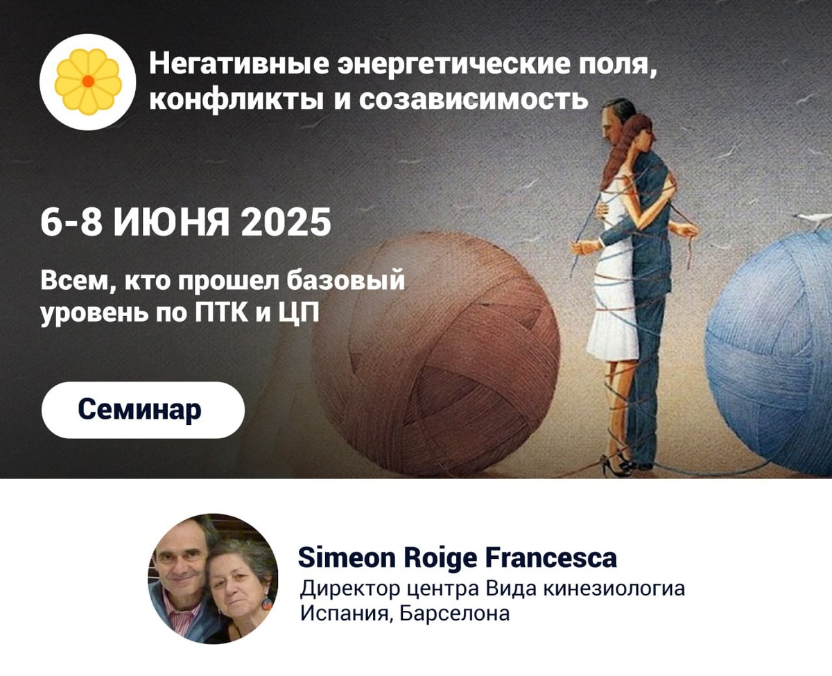 Дорогие друзья!🌿 Приглашаем на семинар "Негативные энергетические поля, конфликты и созависимость", который будет проведен с 6 по 8 июня 2025 года Семинар проведёт автор Франческа Симеон - директор центра Вида кинезиологиа. Испания, Барселона ❗️У вас редкая возможность услышать и поучиться у самого автора 🔘 В энергетической модели межличностные конфликты включают эмоциональные, ментальные и энергетические проекции 🔘 Ответственность за свое состояние означает способность пере-организовать аспекты, которые энергетически поддерживают эти энергетические проекции 🔘 Мы не будем углубляться в системы убеждений относительно энергии, а освоим техники балансировки подобных состояний ☝️ Созависимость — это хороший пример подобных взаимоотношений. Подробнее о вебинаре можно узнать в личных сообщениях группы ВК или по ссылке — https://kinesioportal.ru/events/event15302.php