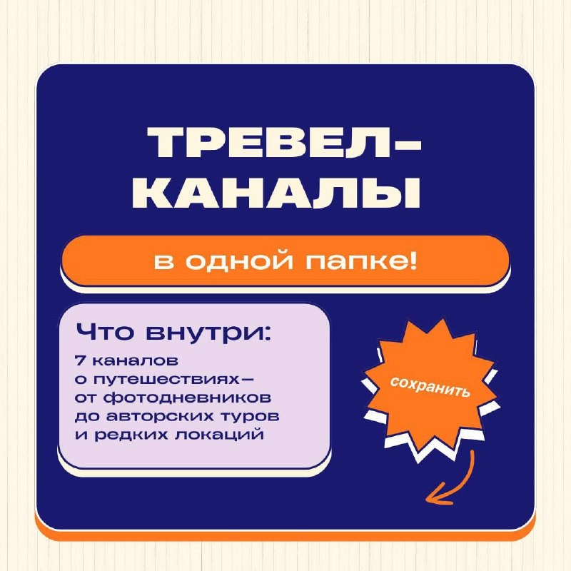📁 Полезные тревел-каналы в одном месте Собрали для вас крутые каналы о путешествиях— от фотодневников до авторских туров и редких локаций. Что внутри: 🔸 5500+ авторских туров от Клуба Гидов по уникальным местам России и мира 🔸 Жизнь в Калининграде: готовые маршруты куда сходить, интересные места 🔸 Фотодневники из живописных мест мира и России 🔸 Россия глазами проекта "Большая страна". Туры по России от прямых организаторов 🔸 Обои и пресеты, чтобы твои кадры были как открытки 🔸 Старинные усадьбы и уникальные памятники архитектуры Центральной России 🔸 Авторский блог про путешествия по России 🔸 Канал фотографа, публициста, автора книги «Исчезающий Север» 👉🏻 Добавить папку — нажмите и папка сразу появится у вас в Telegram