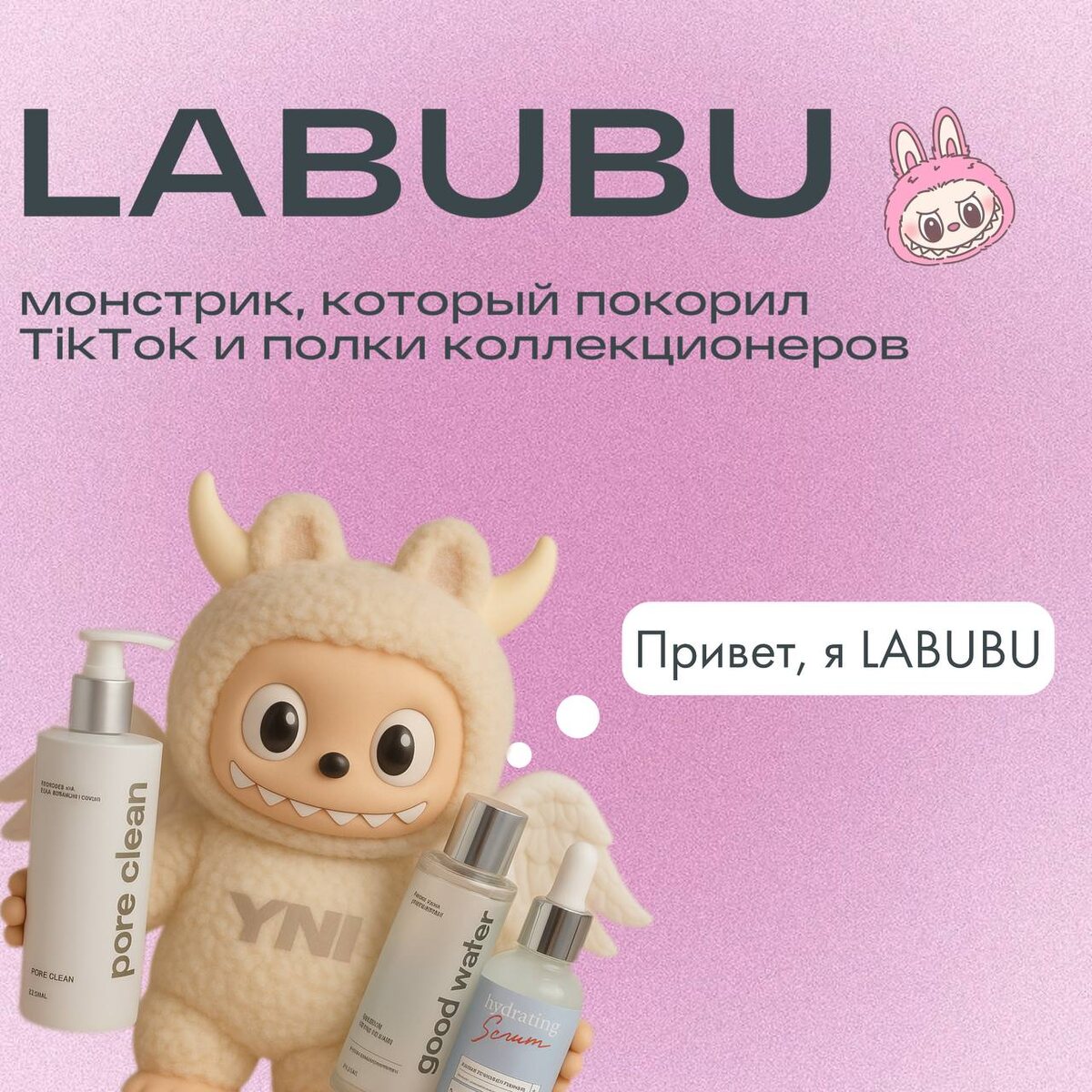LABUBU: монстрик, который покорил TikTok и полки коллекционеров ⭐️ Если вы ещё не встретили эту лохматую мордашку в ленте — знакомьтесь: LABUBU. Маленький, ушастый, с глазами и ехидной улыбкой. 🪭Кстати, а вы знали, что это девочка?) LABUBU — не просто игрушка. Это эмоция, вайб и культурный феномен. Родом из вселенной The Monsters, придуманной художником Kasing Lung. LABUBU — вроде бы монстрик, но скорее милый инопланетянин, который всегда выглядит так, будто только что проснулся… и сразу попал на фотосессию. В коллекционном мире это — настоящая звезда: лимитированные тиражи, коллаборации, охота на редкие версии. Их скупают к-поп исполнители и другие селебрити. Рианна, Ким Кардашьян вообще скупила всю коллекцию. Мы не смогли пройти мимо очарования LABUBU и решили узнать, что бы она выбрала из уходовой линейки You Need It и YNI Lite: 💦Pore Clean гель — это база, даже монстрик знает толк в хорошем умывании. Особенно после ночи в коробке. ☁️ Face Polish — ведь его шерстяная шкур