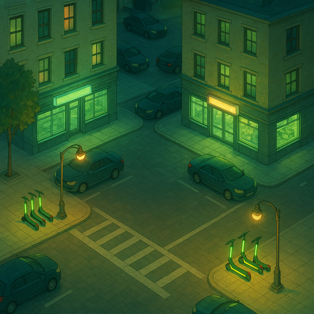 На тротуаре, под теплым янтарным светом фонаря, стоят электросамокаты. Чёрные силуэты с подсвеченными корпусами, словно дремлющие часовые, застылые, но готовые в любой момент вновь пуститься в путь. Они не издают звуков, не мигают яркими огнями — просто стоят, спокойно и уверенно, как будто охраняют этот кусочек улицы, этот клочок ночи.
