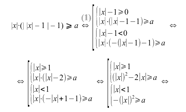 В приведённых записях переход (1) представляет рассмотрение разных знаков подмодульного выражения |x| – 1 . На стадии (2) расписано решение неравенства |x| ⩾ 1, этап (3) – замена системы из неравенства и объединения неравенств на объединение из двух систем. С перехода (4) выполняется выделение полного квадрата в неравенствах x² – 2x ⩾ a и x² + 2x ⩾ a.