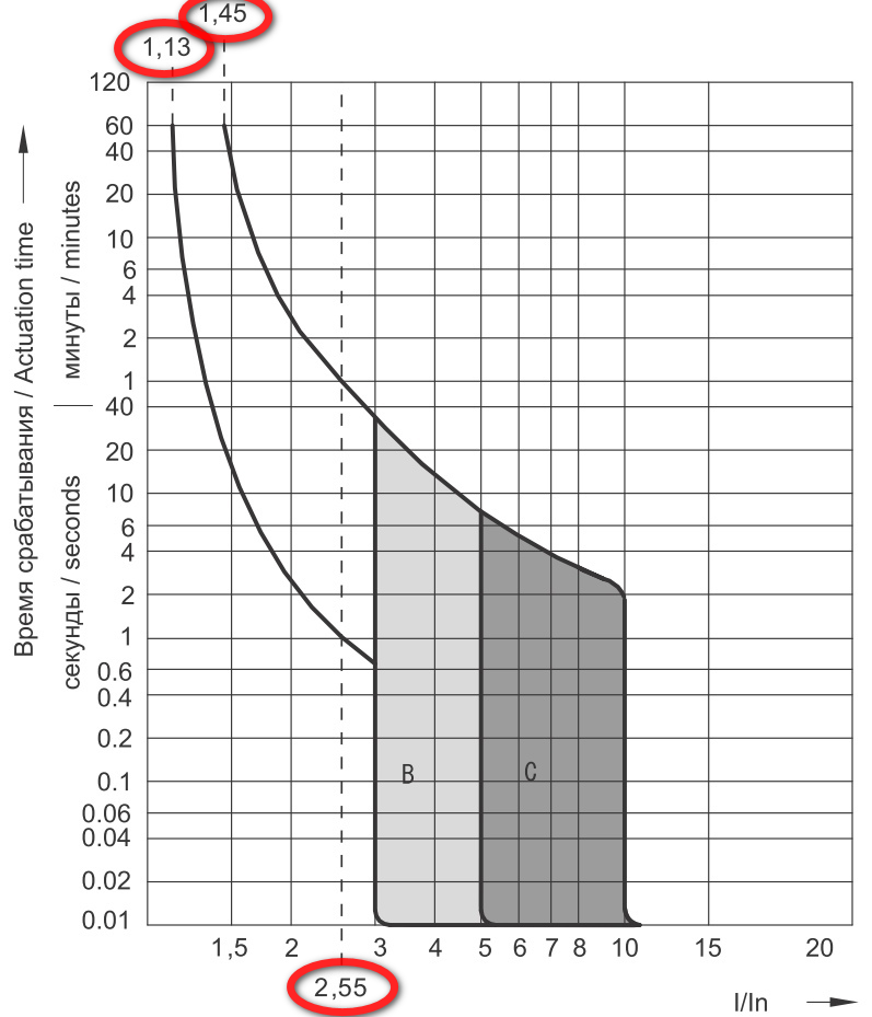 - 2,55 - проверочный ток (должен отключиться за время от 1с до 1 мин)