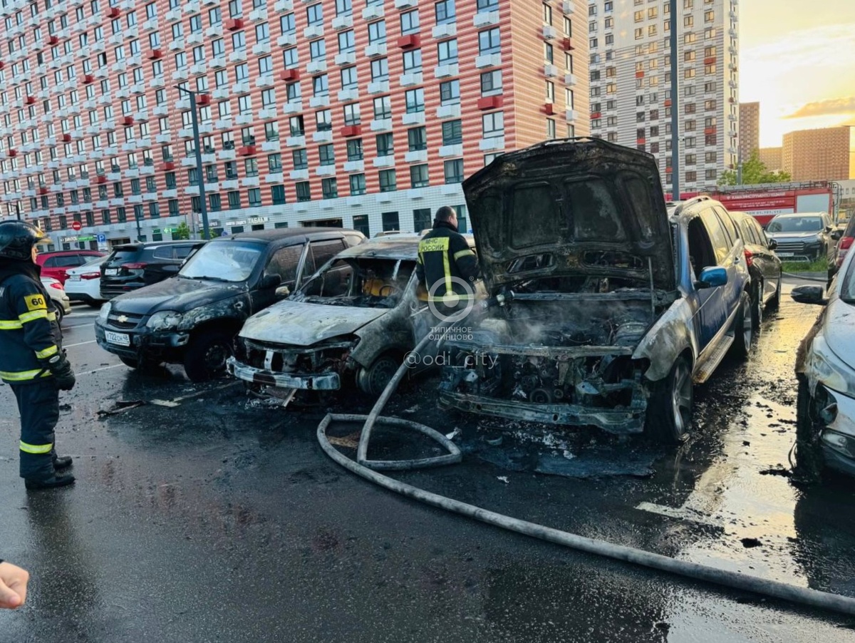 Три автомобиля сгорели при пожаре на парковке в Одинцово-1 Возгорание началось с синей BMW - сначала из-под капота пошёл густой дым, а затем появилось открытое пламя, которое моментально перекинулось на соседние транспортные средства. На место происшествия оперативно прибыли расчёты спасателей, которые ликвидировали возгорание. Специалисты рассматривают версию о коротком замыкании в электропроводке BMW как наиболее вероятную причину происшествия. Источник