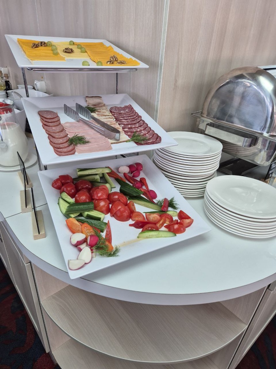 Завтраки во время круиза Завтраки в формате шведского стола, достаточно разнообразные. Основа: омлет, сосиски, нарезка колбаски, сыров, овощей, творог, йогурты, хлопья, фрукты, хороший чай, кофе, какао, соки. #Москва #речнойкруиз #Водоходъ #завтраки