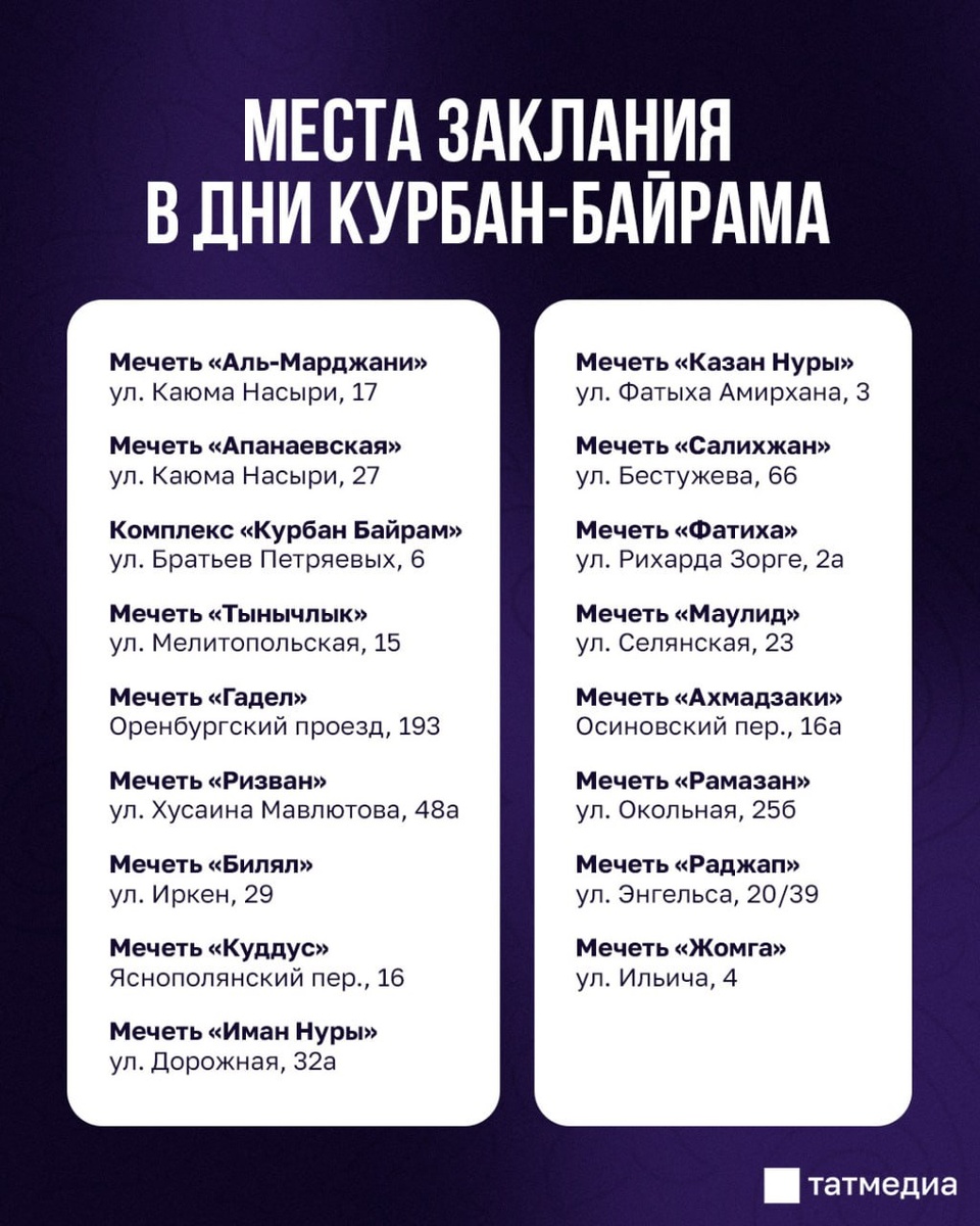 В ответ на пост 🐏⚜️ В Казани определены места заклания в дни Курбан-байрама Один из главных праздников мусульман – Курбан-байрам – ежегодно отмечается в 10-й день месяца Зуль-хиджа. В этом году эта дата выпадает на 6 июня. Духовное управление мусульман РТ сообщило об определении мест заклания в дни Курбан-байрама в Казани. Праздничные мероприятия начнутся с утреннего намаза, после чего в течение трех дней будут проходить заклания жертвенных животных. В Казани для этого подготовлены 17 специально отведенных мест. @tatmediaofficial